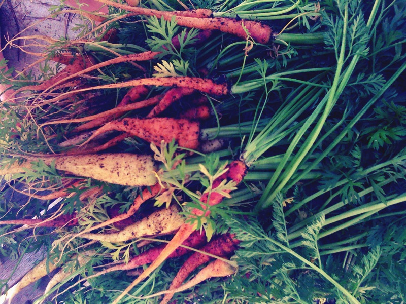 I began to thin carrots in one of the overflowing garden beds today- arms loaded down by the tremendous greenery the carrots produce- end result I began to resemble a pageant winner in 4H.